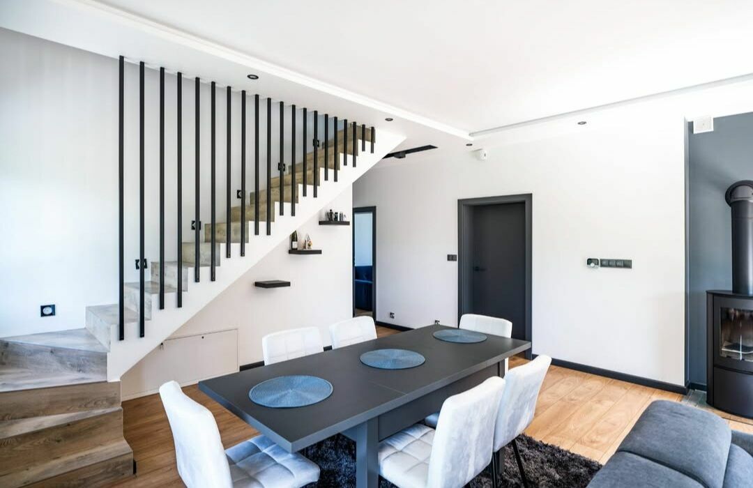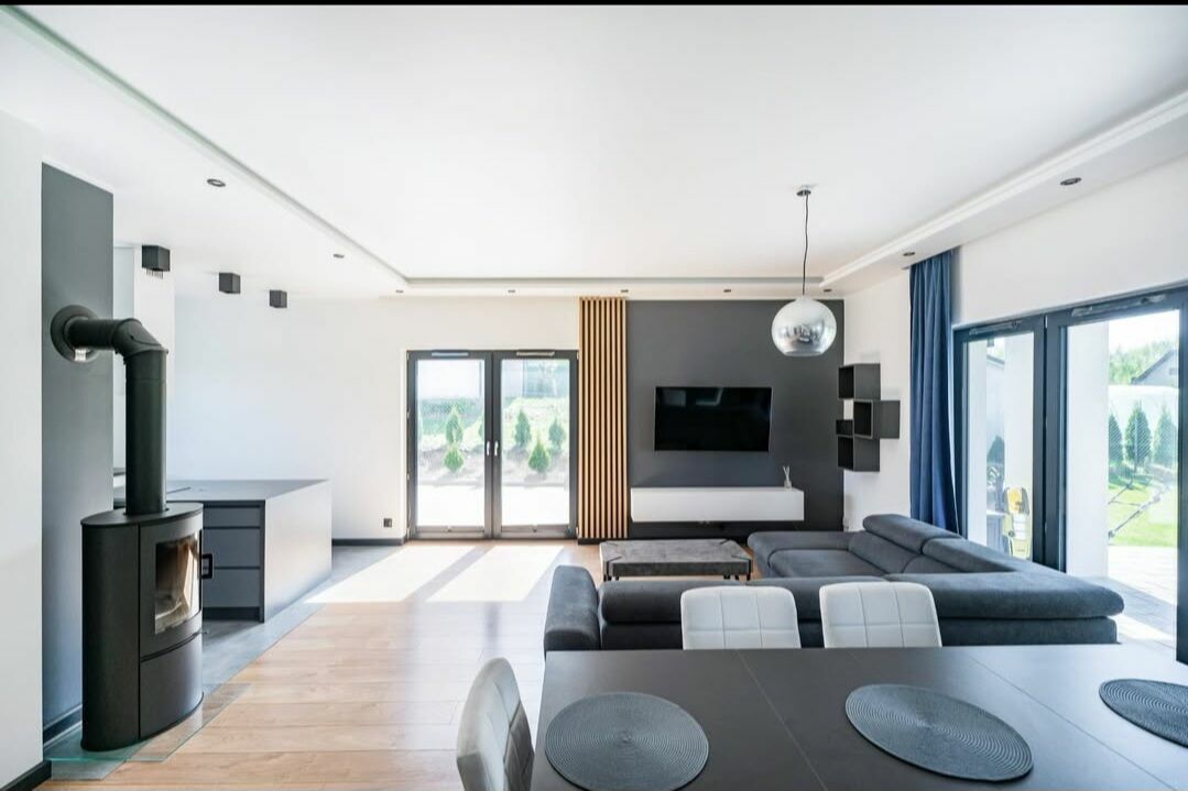 - Salon z dużymi oknami, jadalnią oraz wyjściem na taras i ogród z dwóch stron