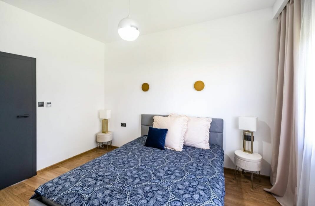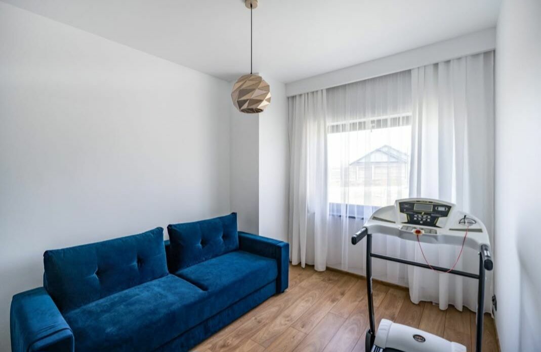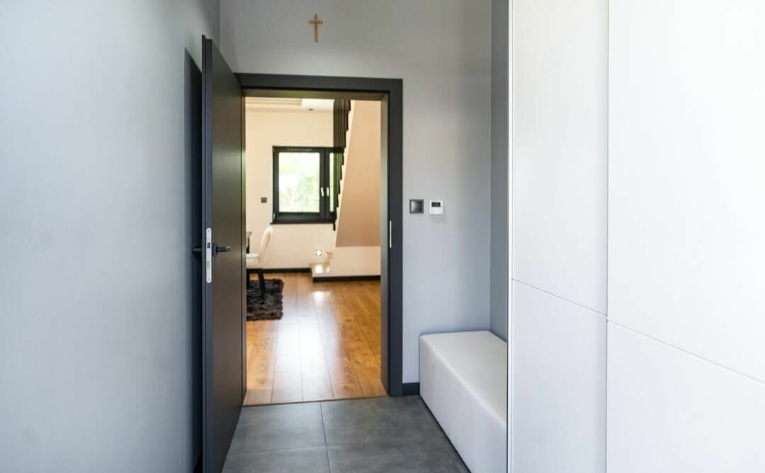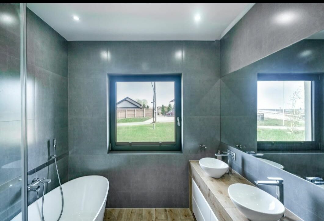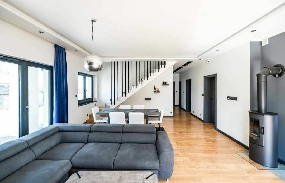 - Salon z dużymi oknami, jadalnią oraz wyjściem na taras i ogród z dwóch stron